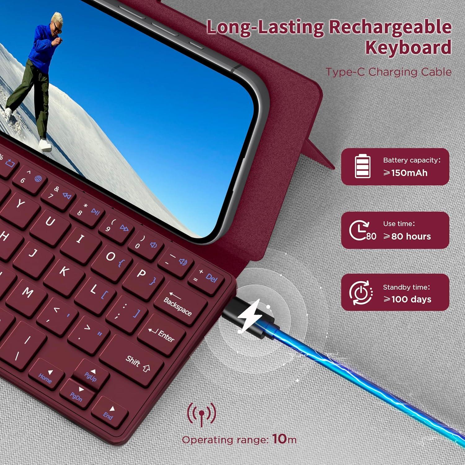 CACOE Wireless Keyboard with Stand, Mini Keyboard for Cell Phone, Ultra-Slim Portable, Foldable, Dual-Channel QWERTY with Stand Holder for Smartphone and More iOS Android Windows, Ocean Blue(Wine Red)